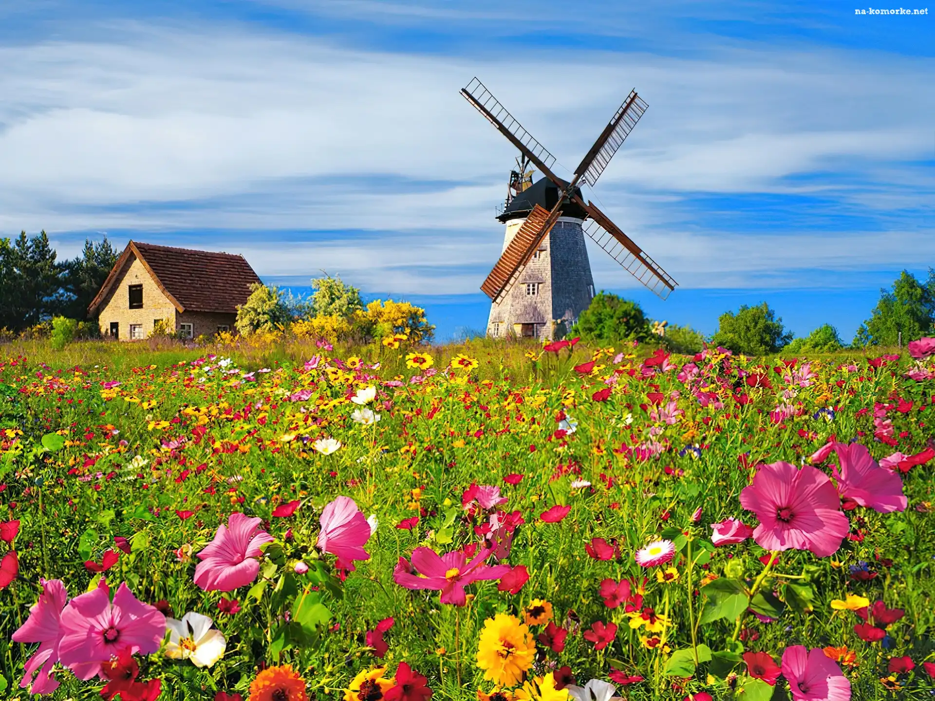 Łąka, Kwiaty, Wiatrak na Komórkę