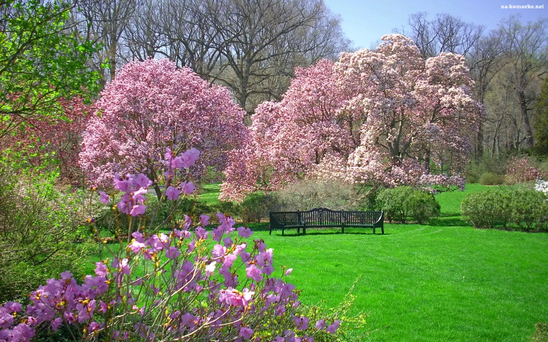 Kwiaty, Drzewa, Kwitnące, Wiosna, Ławka, Park na Komórkę