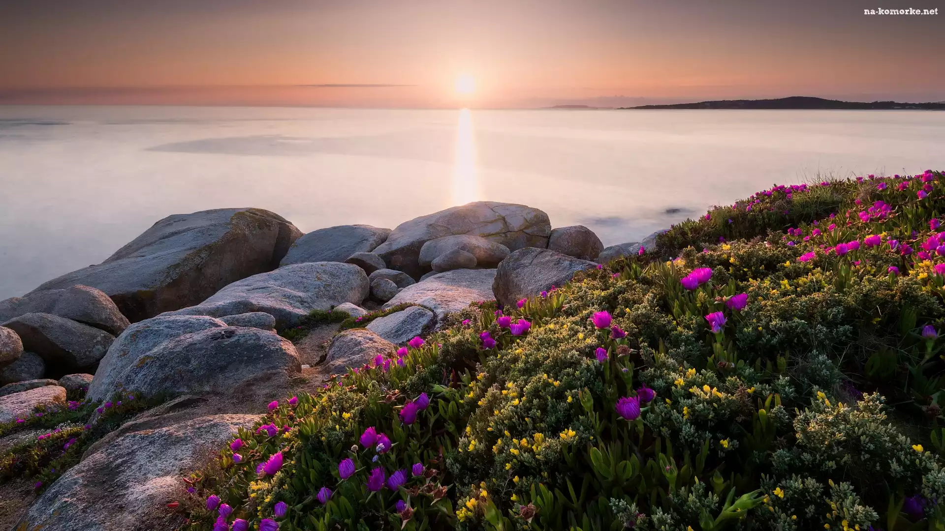 Kwiaty, Morze, Zachód słońca, Brzeg, Kamienie na Komórkę