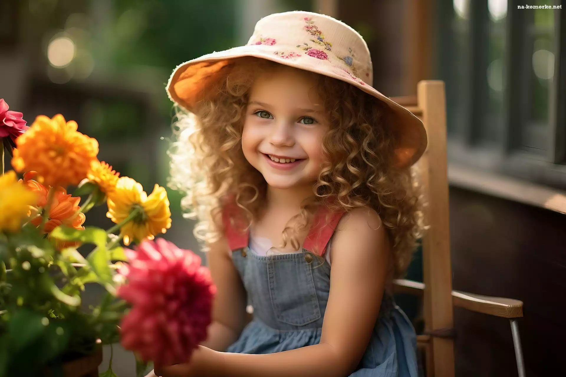 Włosy, Kapelusz, Dziecko, Kwiaty, Uśmiech, Kręcone, Dziewczynka na Komórkę