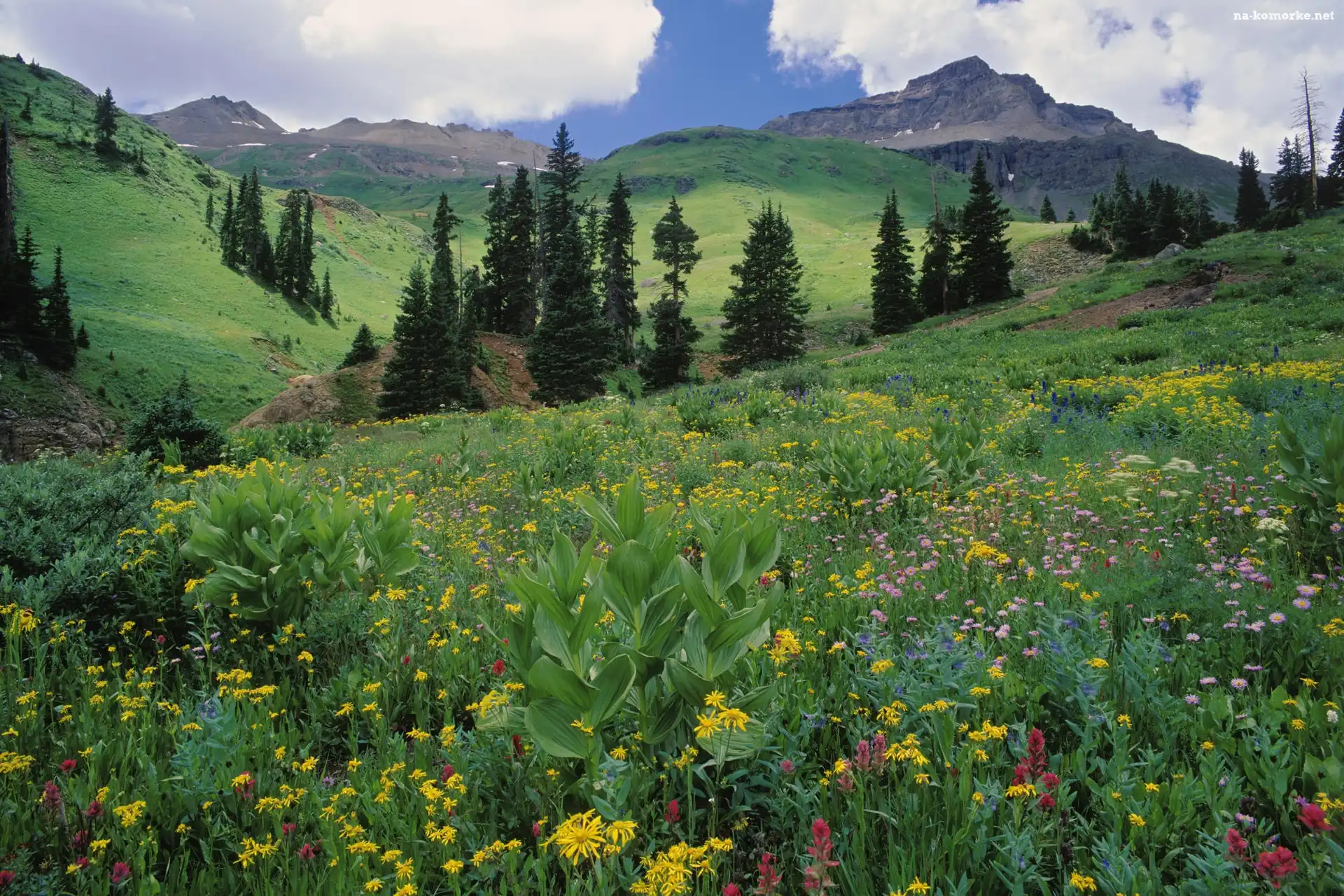 Łąka, Góry, Kwiaty, Drzewa na Komórkę