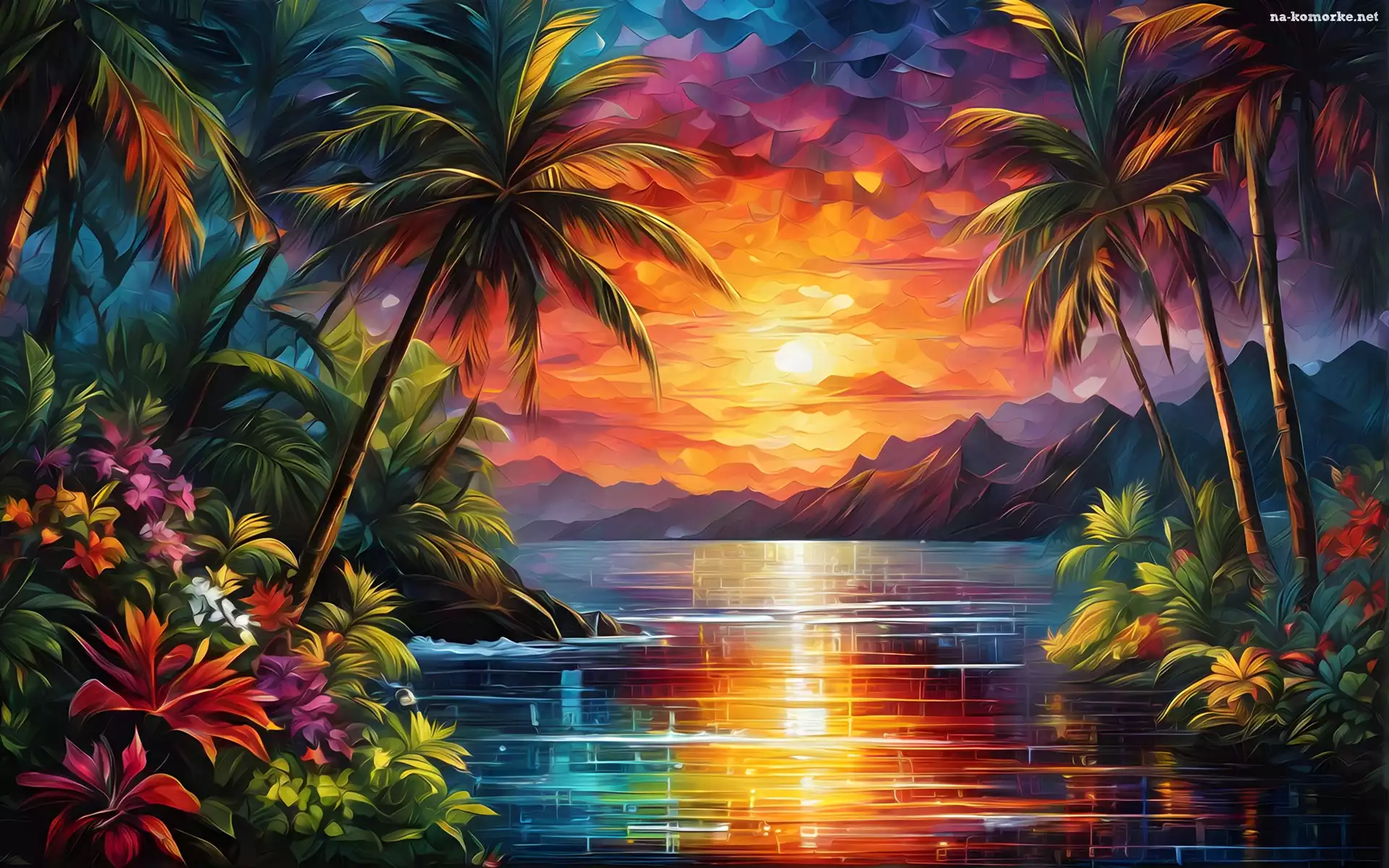 Zachód słońca, Góry, Kwiaty, Grafika, Palmy, Morze na Komórkę