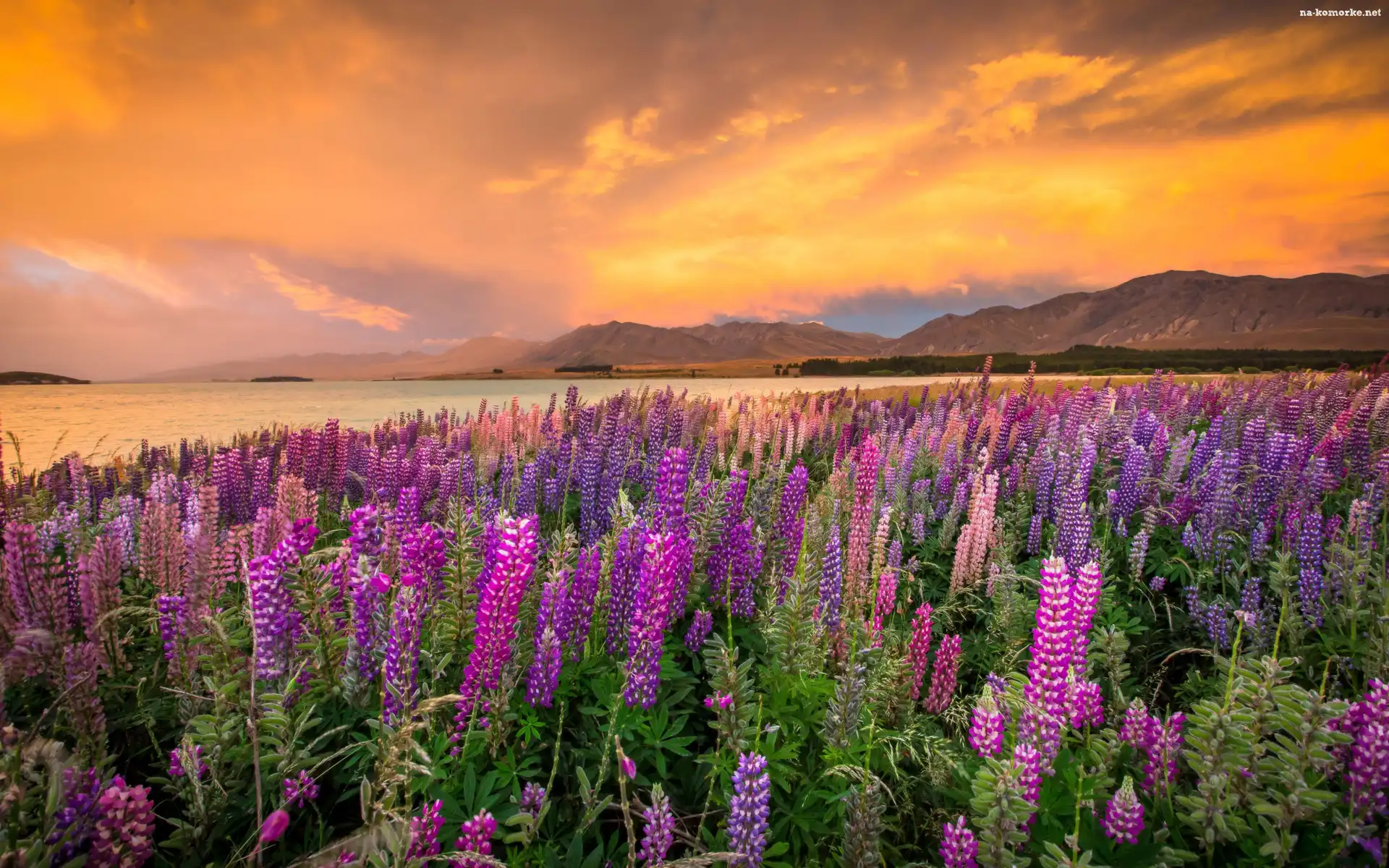 Nowa Zelandia, Łubin, Chmury, Góry, Zachód słońca, Jezioro Tekapo, Kwiaty na Komórkę