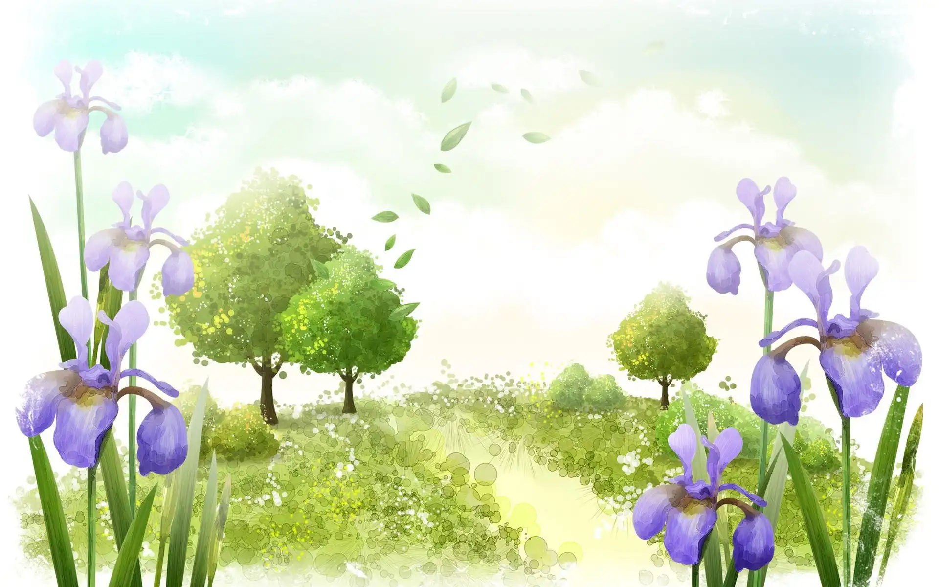 Kwiaty, Drzewa, Irysy, Łąka na Komórkę