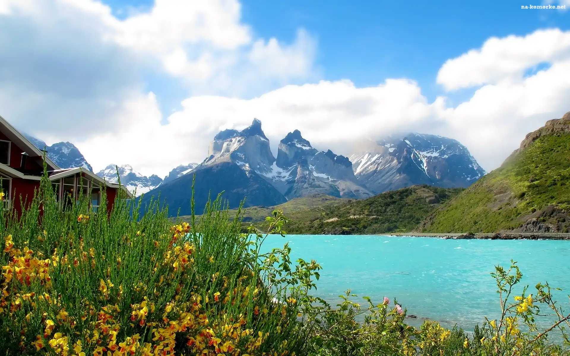 Kwiaty, Góry, Błękitne, Jezioro, Żółte na Komórkę
