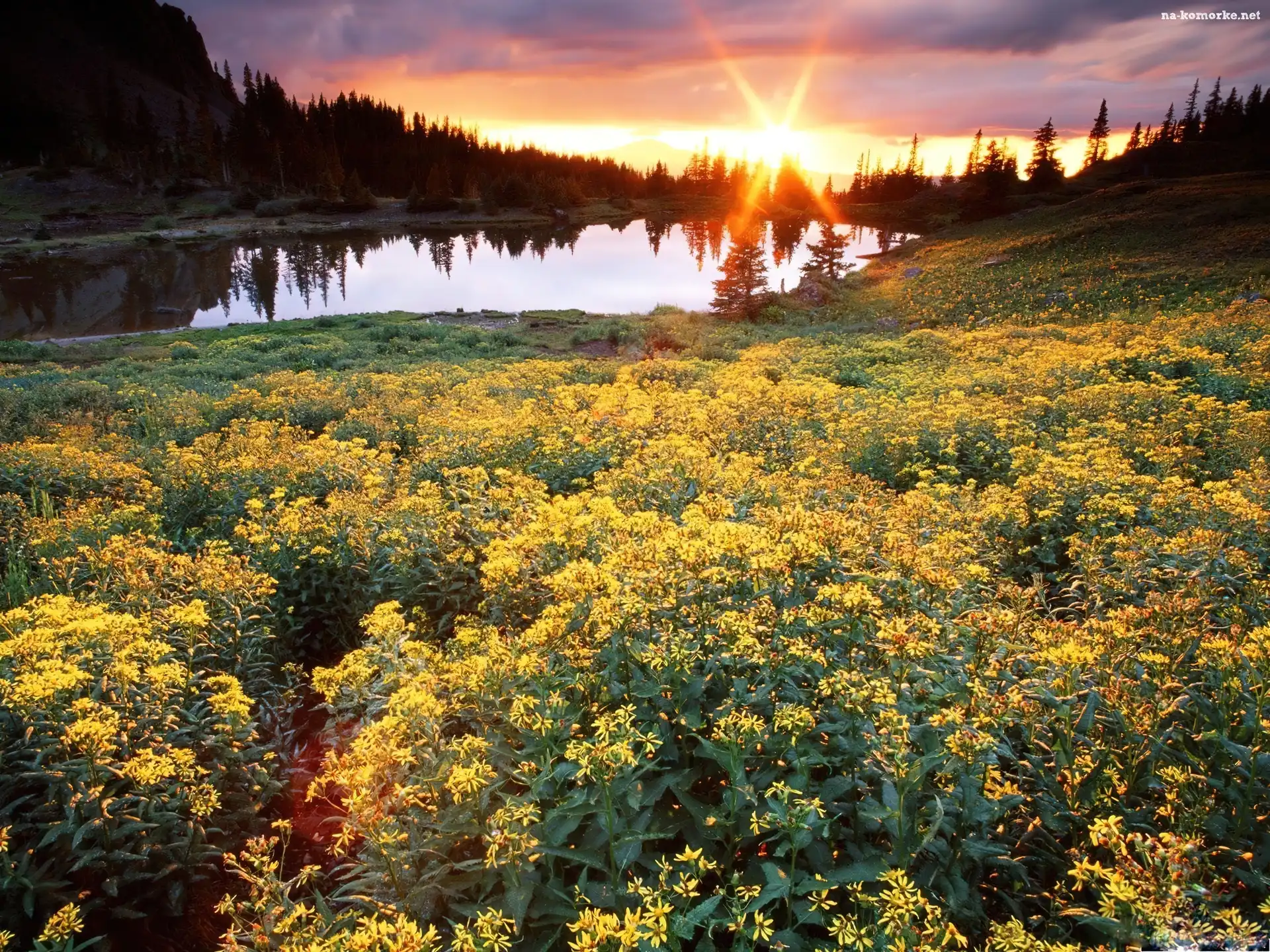 Kwiaty, Zachód, Słońca, Jezioro, Lasy na Komórkę