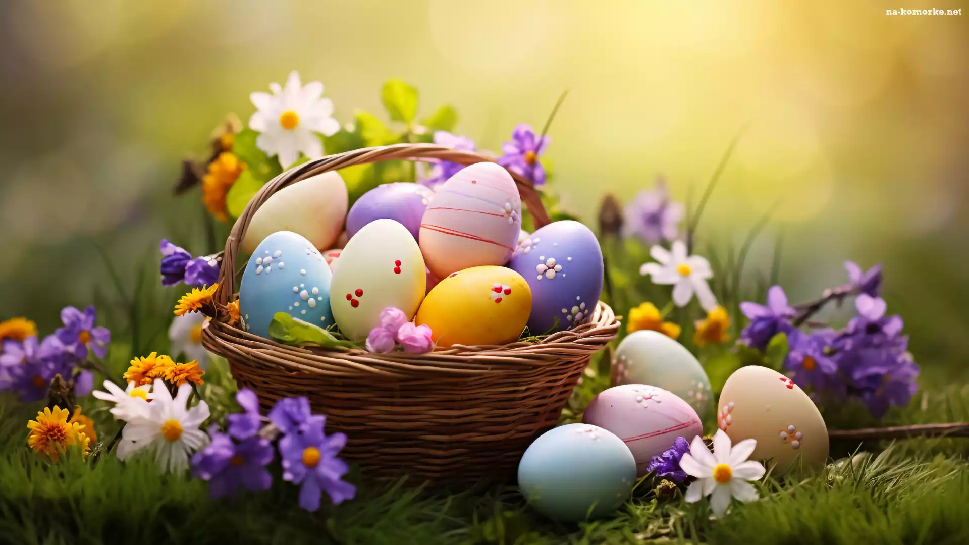 Wielkanoc, Kwiaty, Koszyk, Pisanki, Trawa na Komórkę