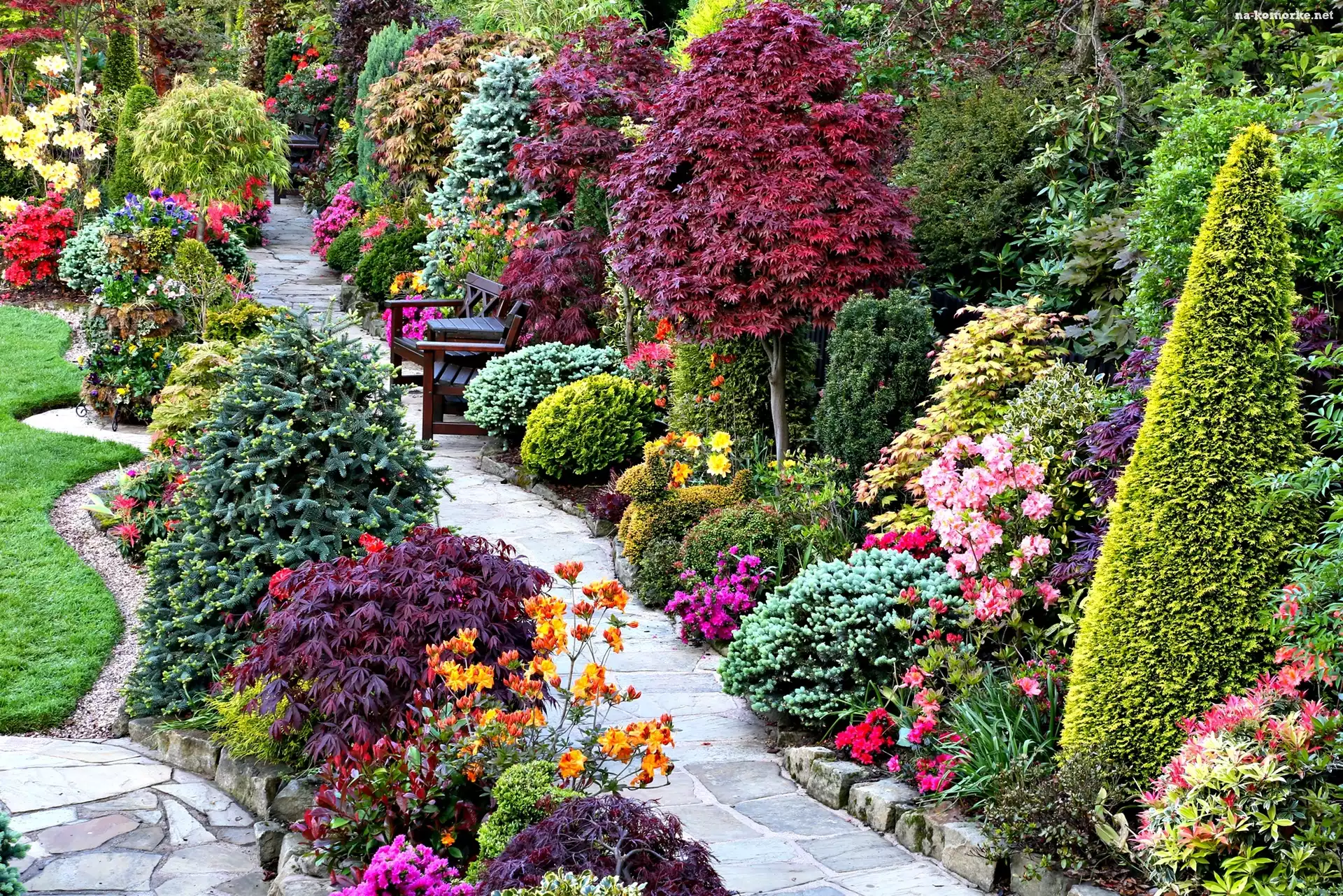 Kwiaty, Kolorowe, Ogród, Ławka, Krzewy, Alejka na Komórkę