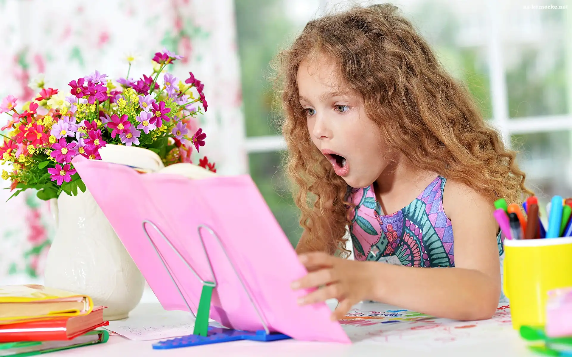 Kwiaty, Zdziwiona, Dziewczynka, Książki, Bukiet na Komórkę