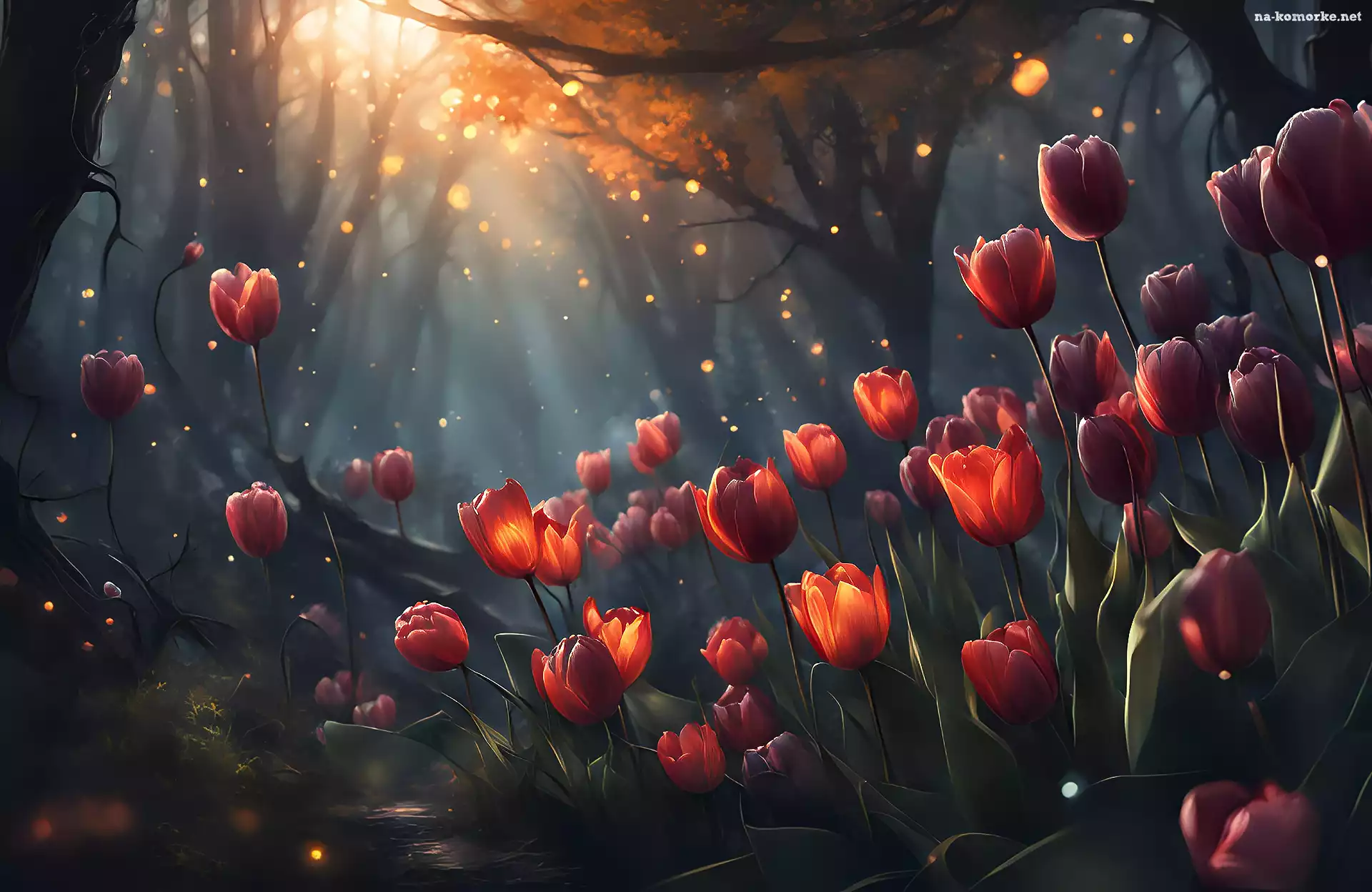 Czerwone, Kwiaty, Las, Tulipany, 2D na Komórkę