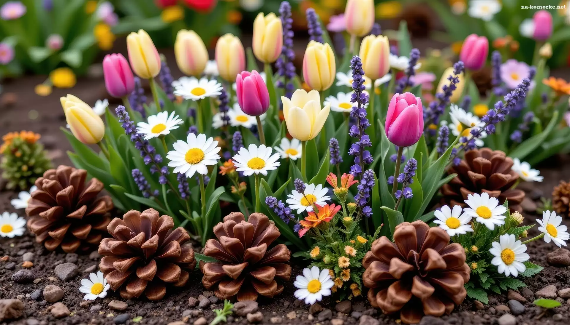 Rabata, Tulipany, Szyszki, Kwiaty, Stokrotki, Lawenda na Komórkę
