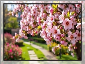 Listki, Drzewo owocowe, Kwiaty, Alejka, Jasnoróżowe, Gałązki na Komórkę