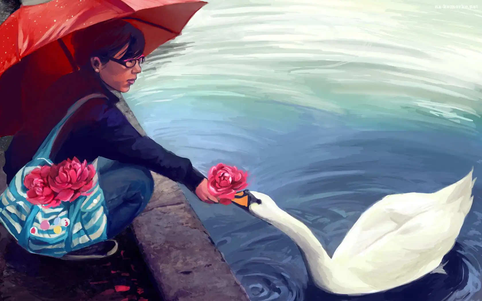 Kwiaty, Dziewczyna, Czerwony, Parasol, Łabędź na Komórkę