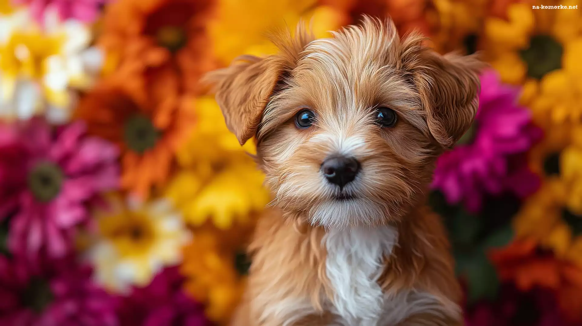Szczeniak, Kwiaty, Pies, Rudo-biały na Komórkę