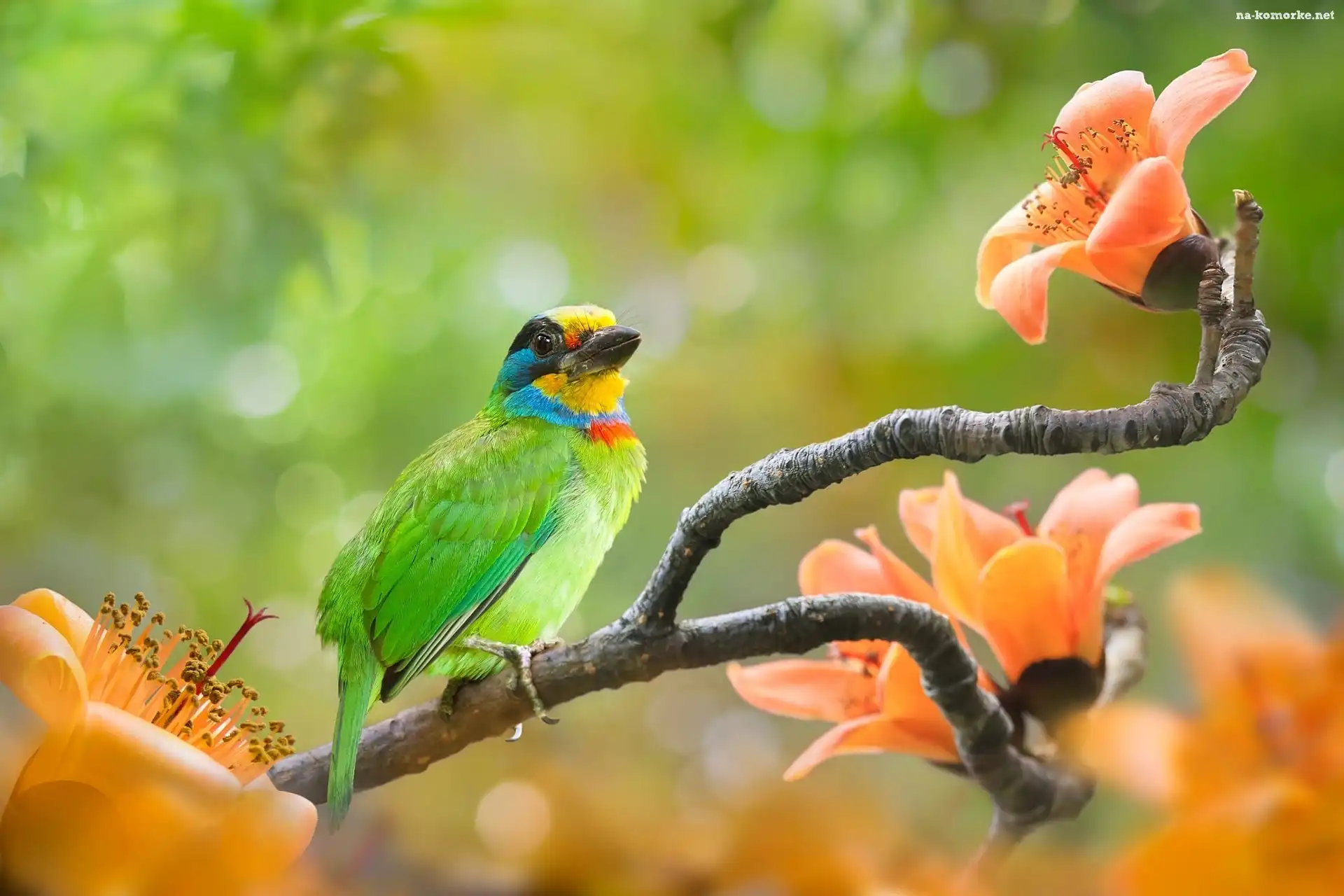 Kolorowy, Kwiaty, Gałązki, Zielony, Ptak, Pstrogłów tajwański, Pomarańczowe na Komórkę