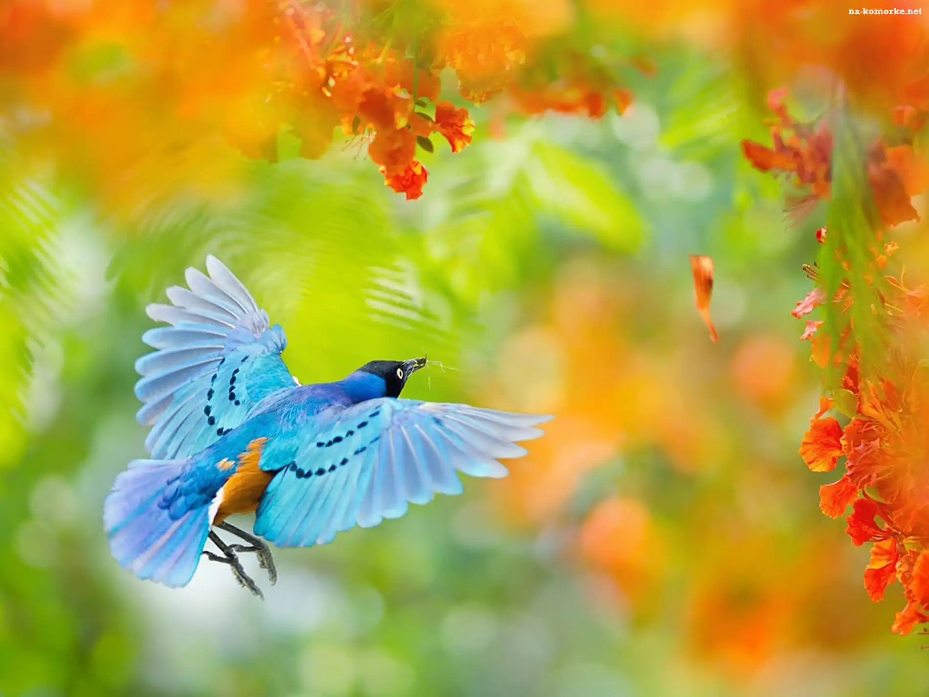 Kwiaty, Makro, Niebieski, Ptak, Pomarańczowe na Komórkę
