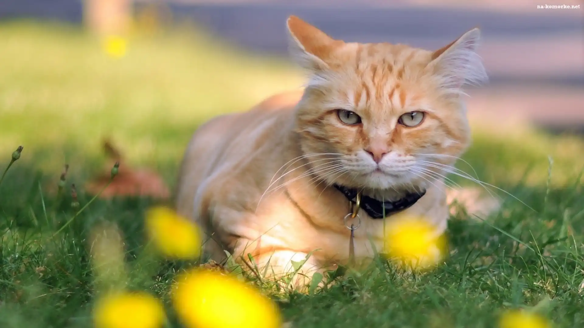 Rudy, Kwiaty, Obroża, Kot, Łąka, Trawa, Żółte na Komórkę