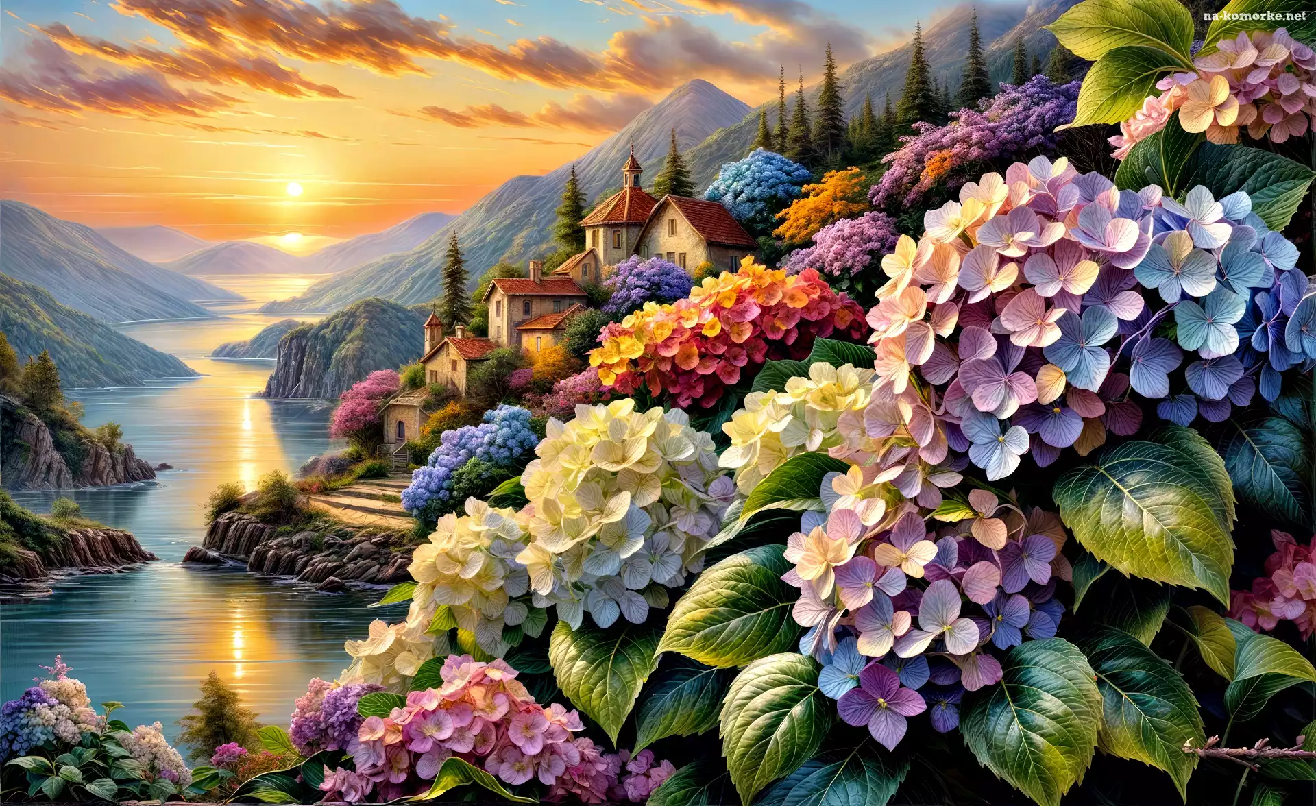 Góry, Wschód słońca, Hortensje, Grafika, Domy, Rzeka, Kwiaty na Komórkę