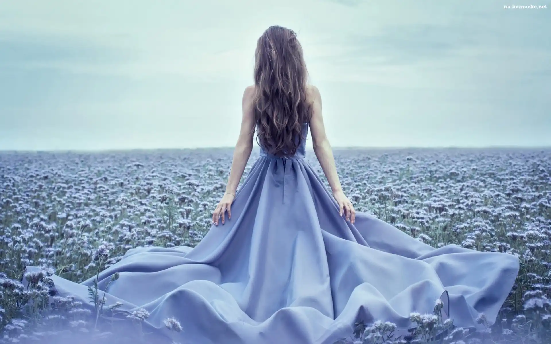 Kwiaty, Kobieta, Niebieska, Sukienka, Łąka na Komórkę