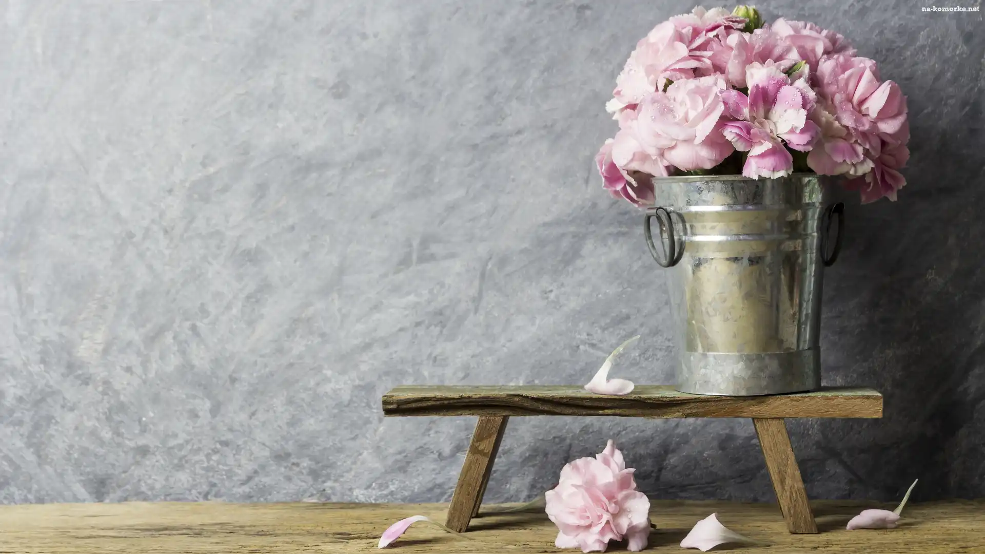 Kwiaty, Ławeczka, Goździki Szabo, Wiaderko na Komórkę