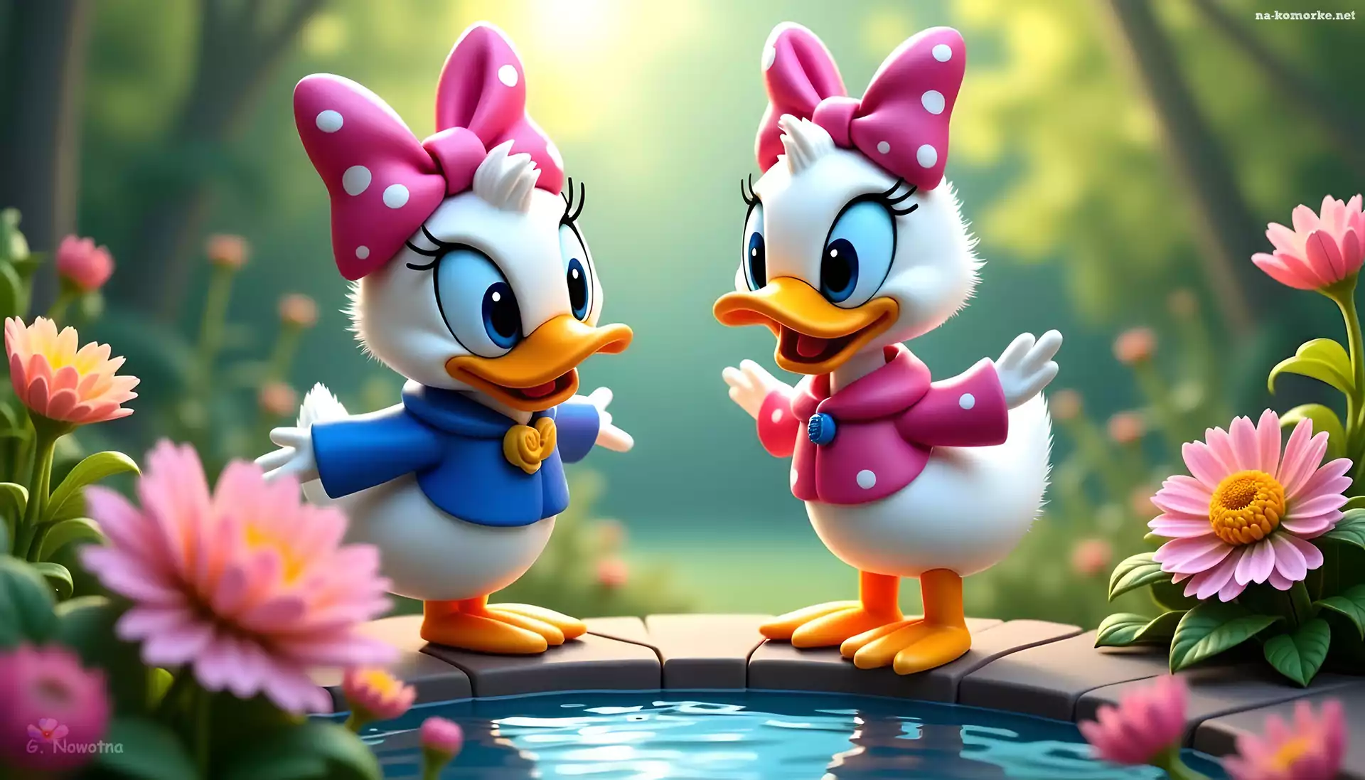 Dwie, Oczko wodne, Kwiaty, Kaczki, Grafika AI na Komórkę
