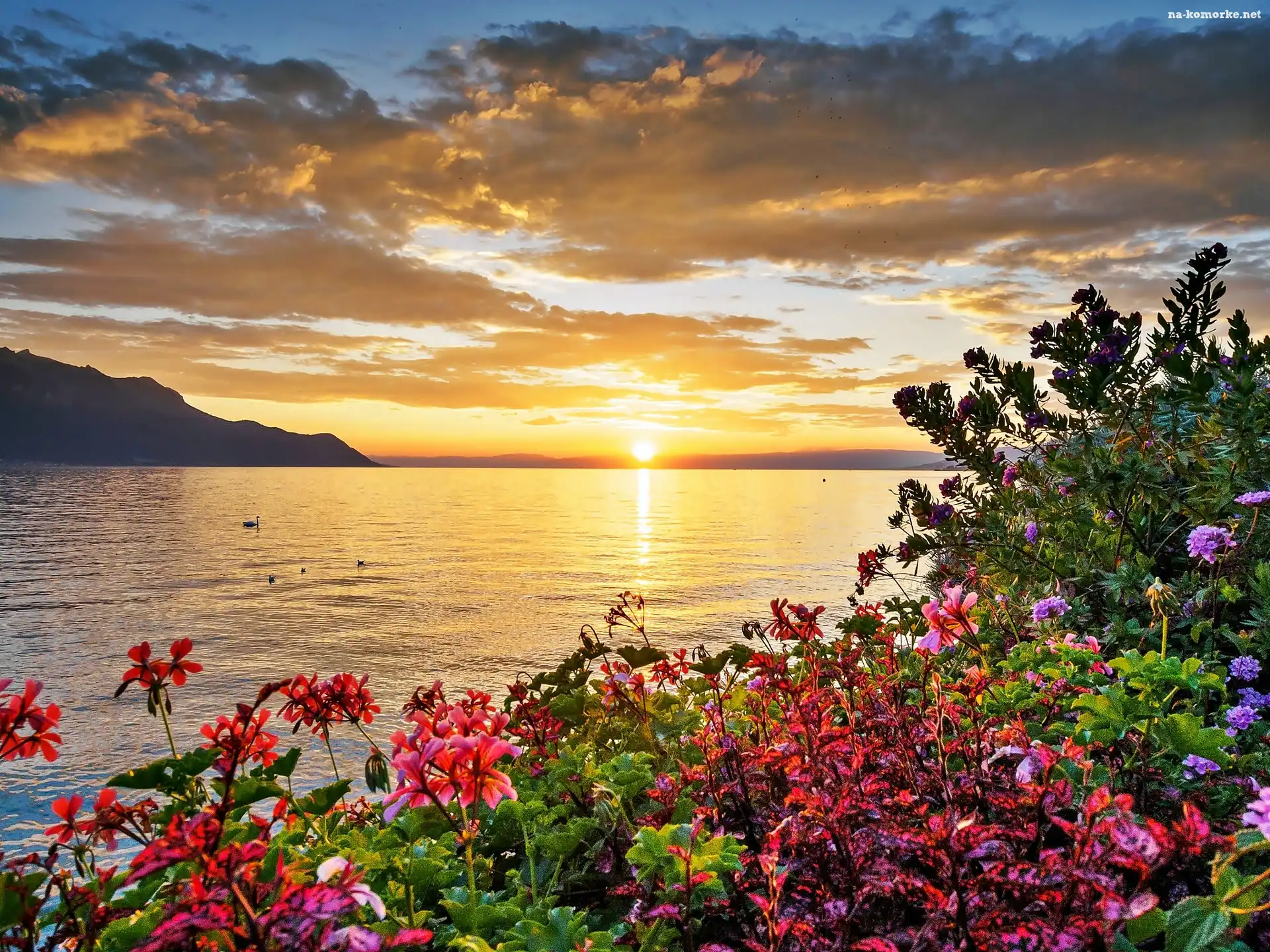 Kwiaty, Jezioro, Chmury, Wschód, Słońca na Komórkę