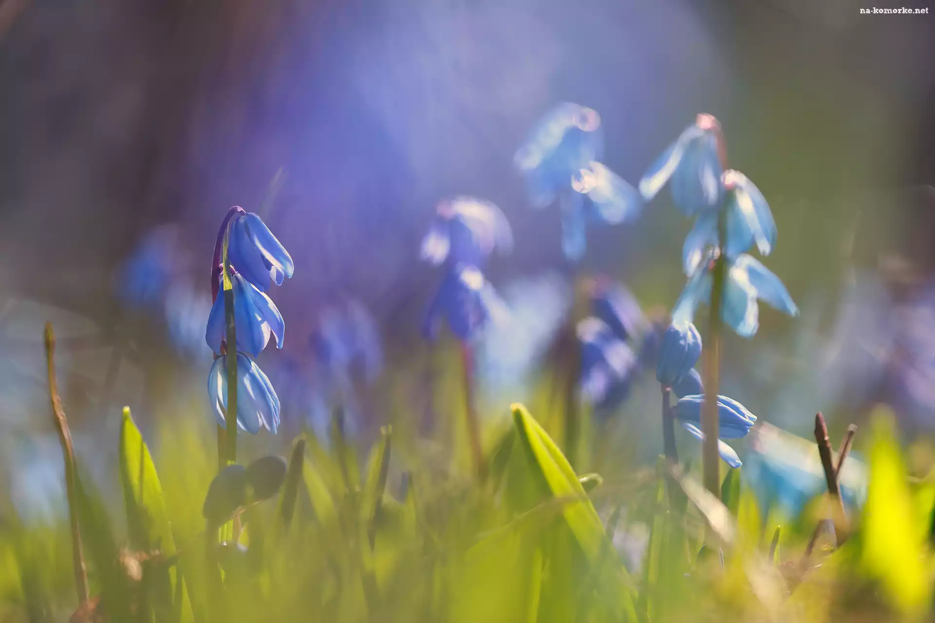 Cebulice syberyjskie, Niebieskie, Kwiaty, Trawa, Zbliżenie na Komórkę