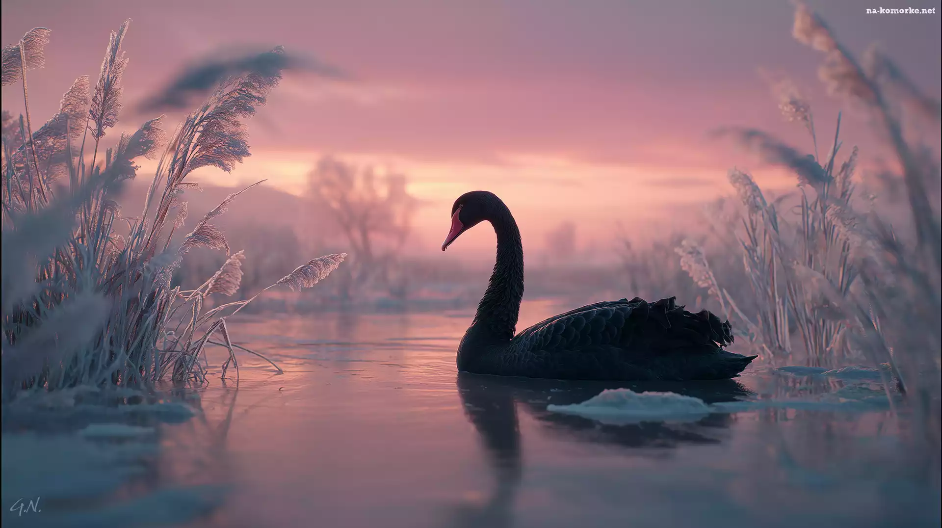 Czarny, Jezioro, Trawy, Łabędź, Grafika AI na Komórkę