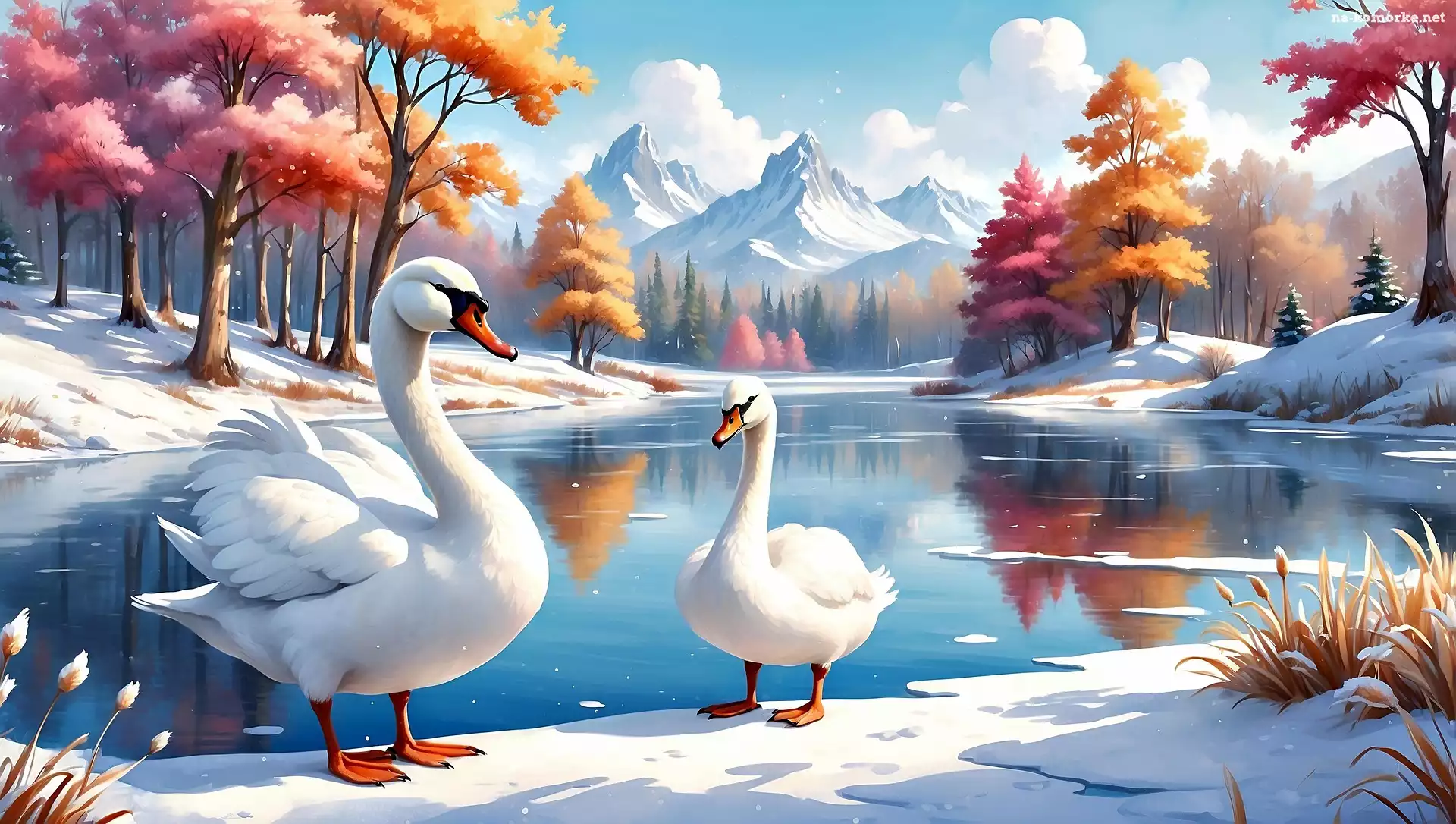Jezioro, Drzewa, Ptaki, Łabędzie na Komórkę
