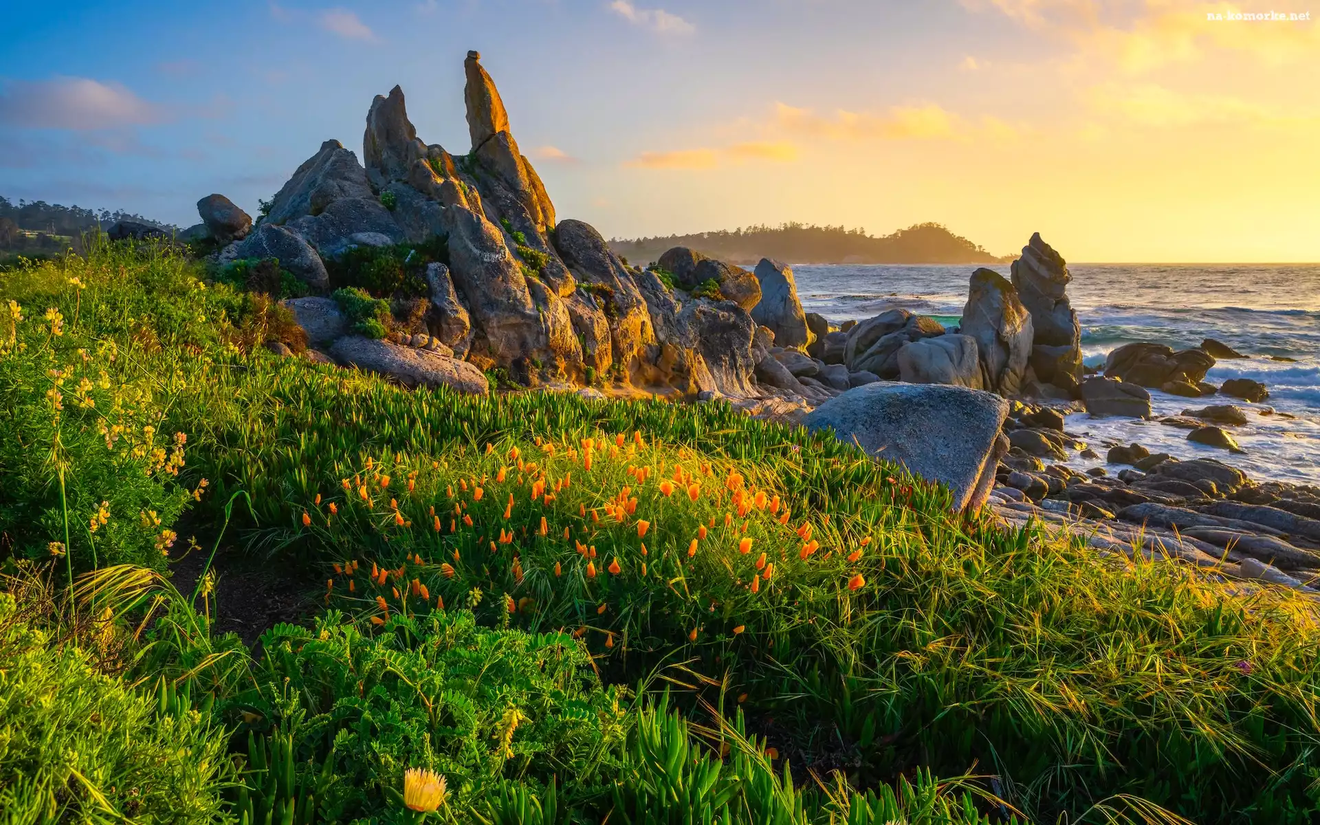 Kalifornia, Półwysep Monterey, Morze, Zatoka Carmel, Łąka, Kwiaty Stany Zjednoczone, Skały na Komórkę |