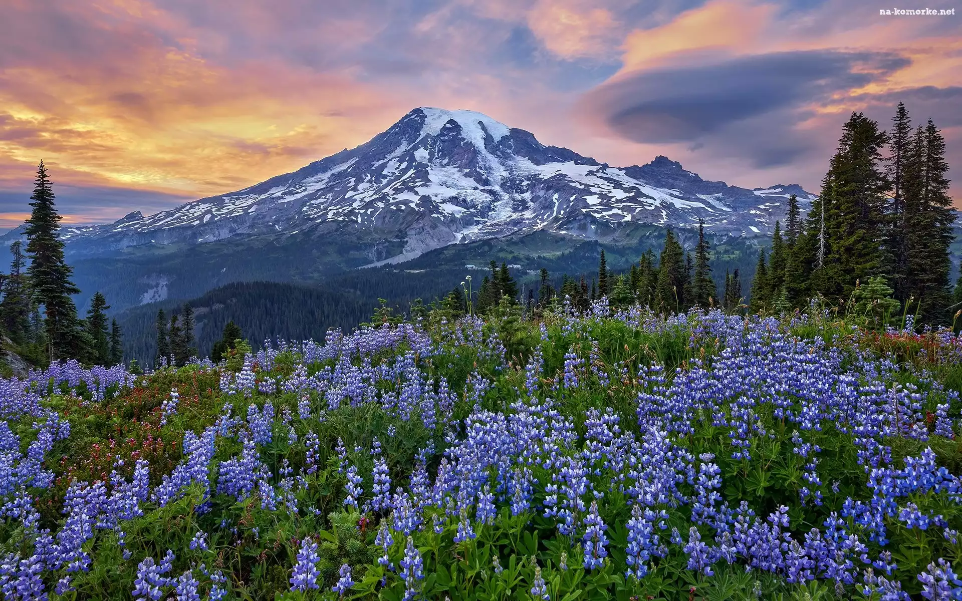 Stan Waszyngton, Park Narodowy Mount Rainier, Łąka, Mount Rainier, Niebieskie, Góry, Drzewa, Stratowulkan, Łubiny, Stany Zjednoczone na Komórkę |