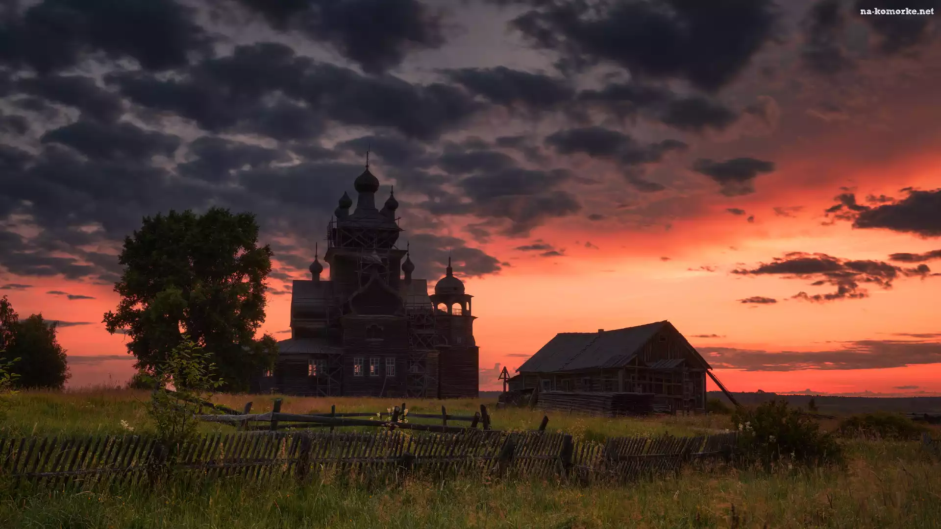 Łąka, Obwód archangielski, Chmury, Cerkiew, Zachód słońca, Rosja, Ogrodzenie, Drzewa na Komórkę
