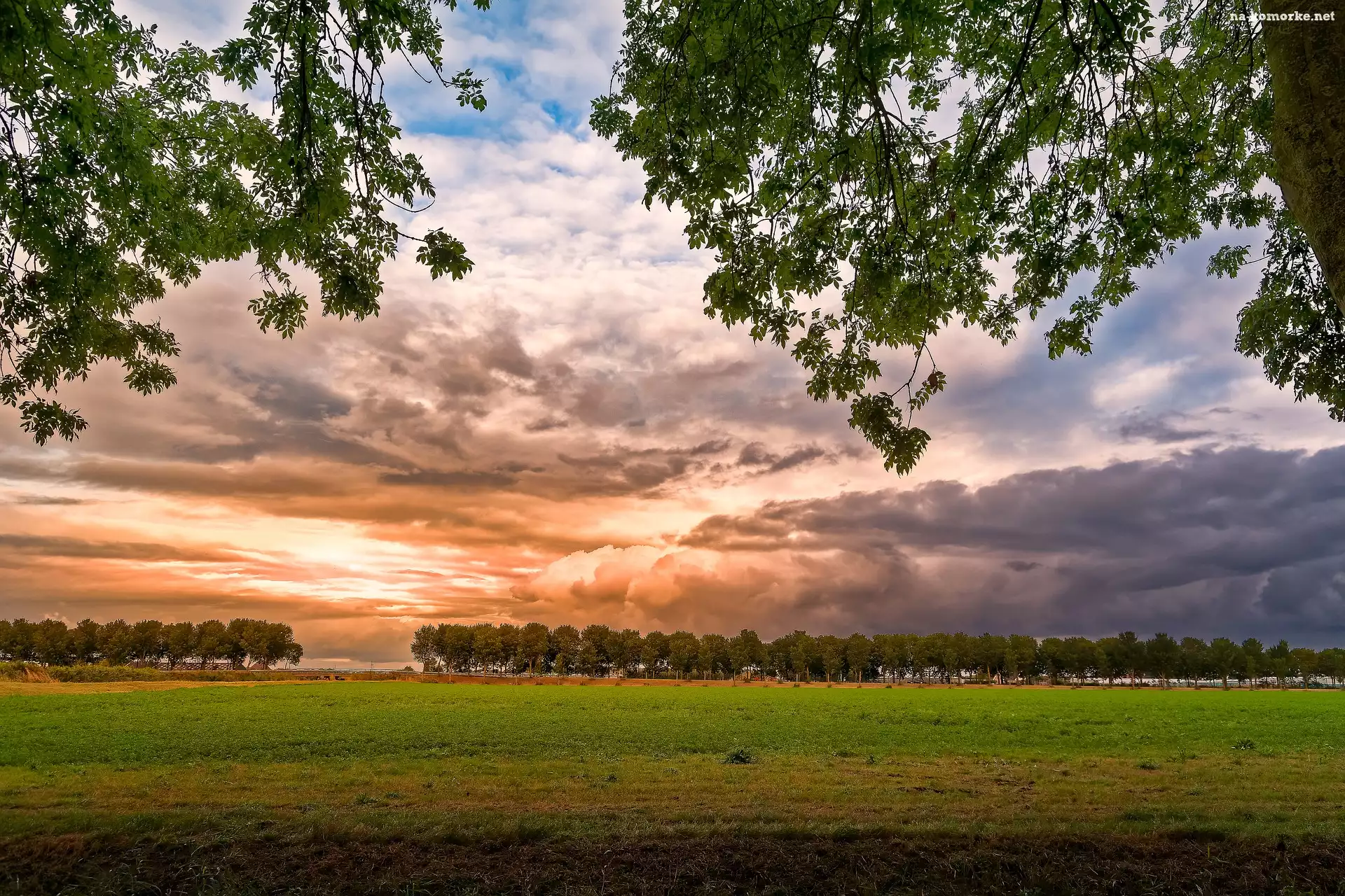 Gałęzie, Zachód słońca, Łąka, Liście, Drzewa, Chmury na Komórkę