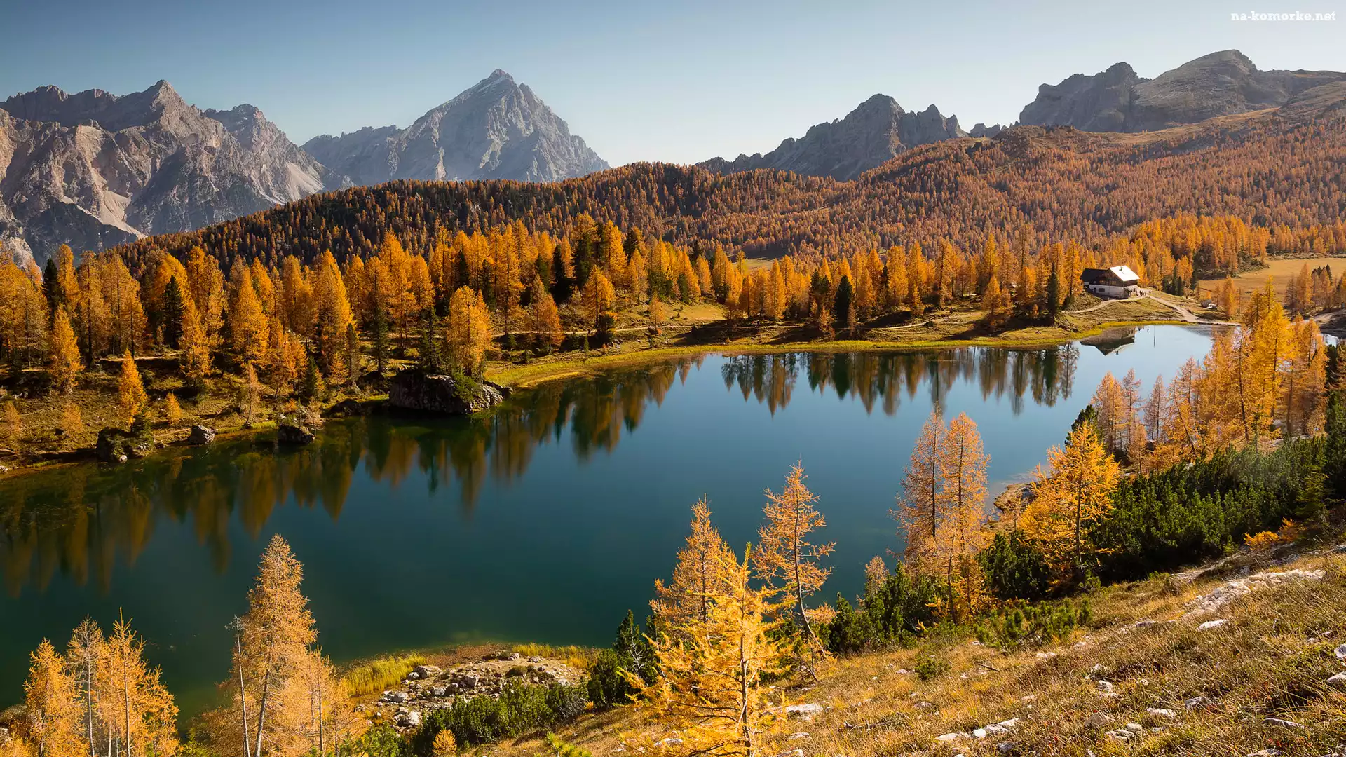 Jesień, Lasy, Włochy, Dolomity, Góry, Federa Lake, Jezioro, Drzewa, Prowincja Belluno na Komórkę