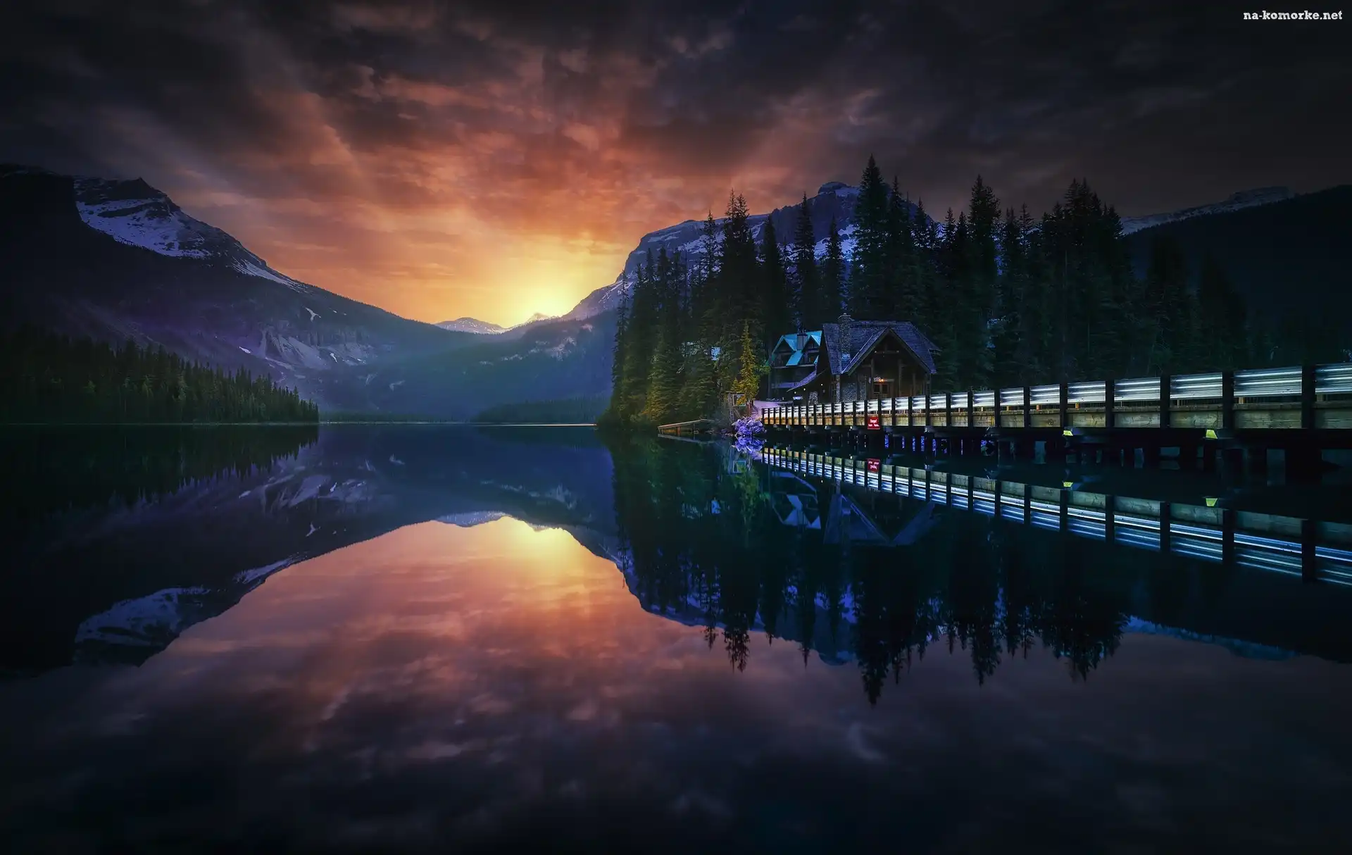 Jezioro Emerald Lake, Park Narodowy Yoho, Kanada, Most, Zachód słońca, Góry na Komórkę
