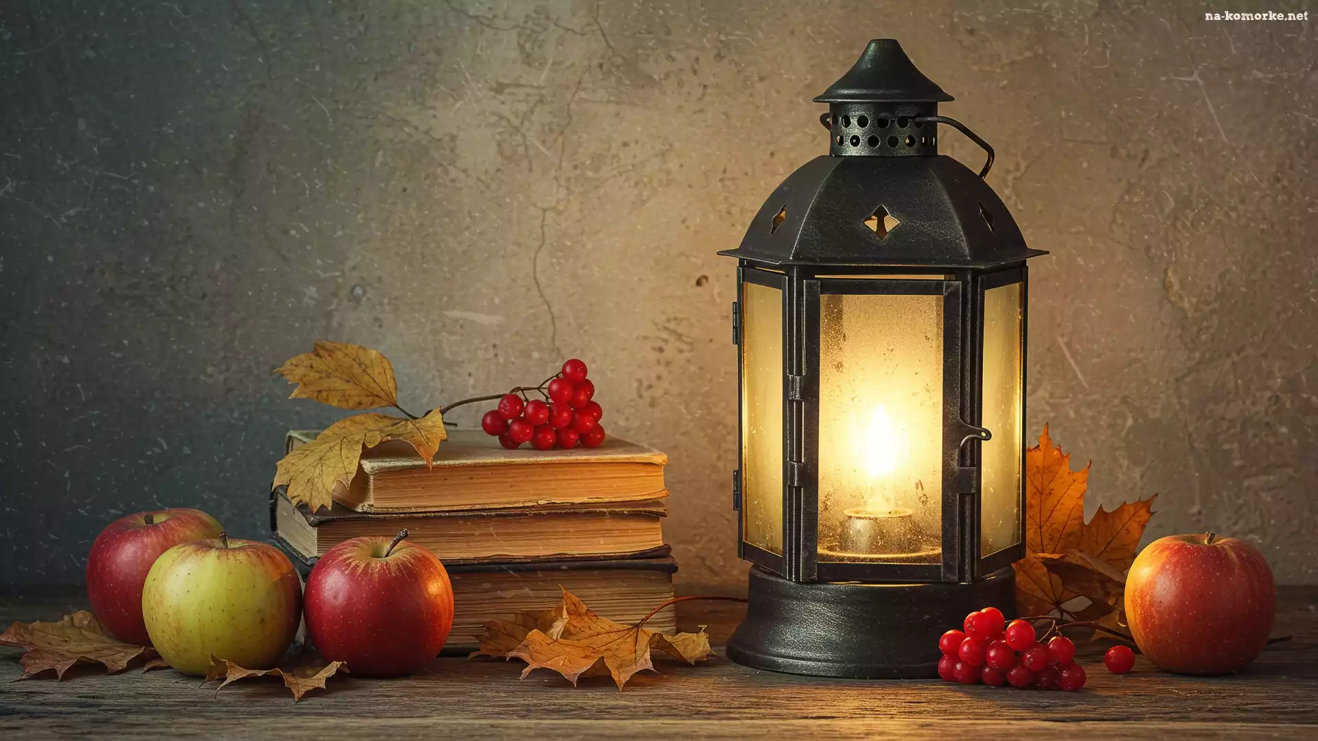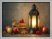Książki, Pożółkłe, Czerwone, Kompozycja, Jagody, Liście, Jabłka, Lampion na Komórkę