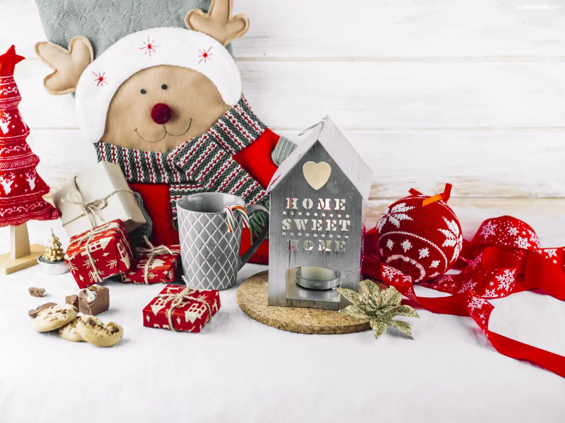 Prezenty, Święta, Maskotka, Choinka, Deski, Bombki, Ciasteczka, Kubek, Lampion na Komórkę