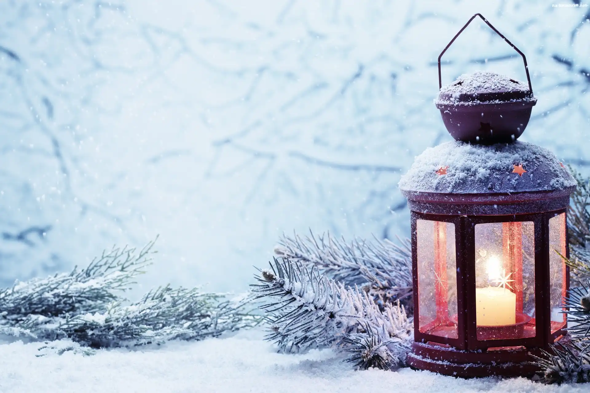 Dekoracja, Lampion, Świeca, Gałązki, Śnieg na Komórkę