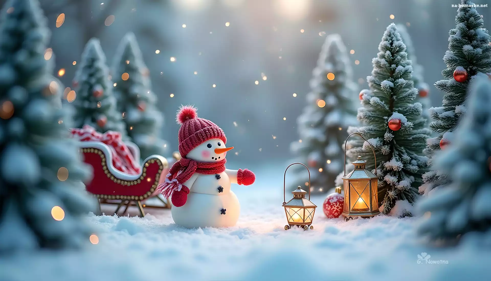 Zima, Grafika, Bałwan, Śnieg, Boże Narodzenie, Choinki, Lampiony na Komórkę