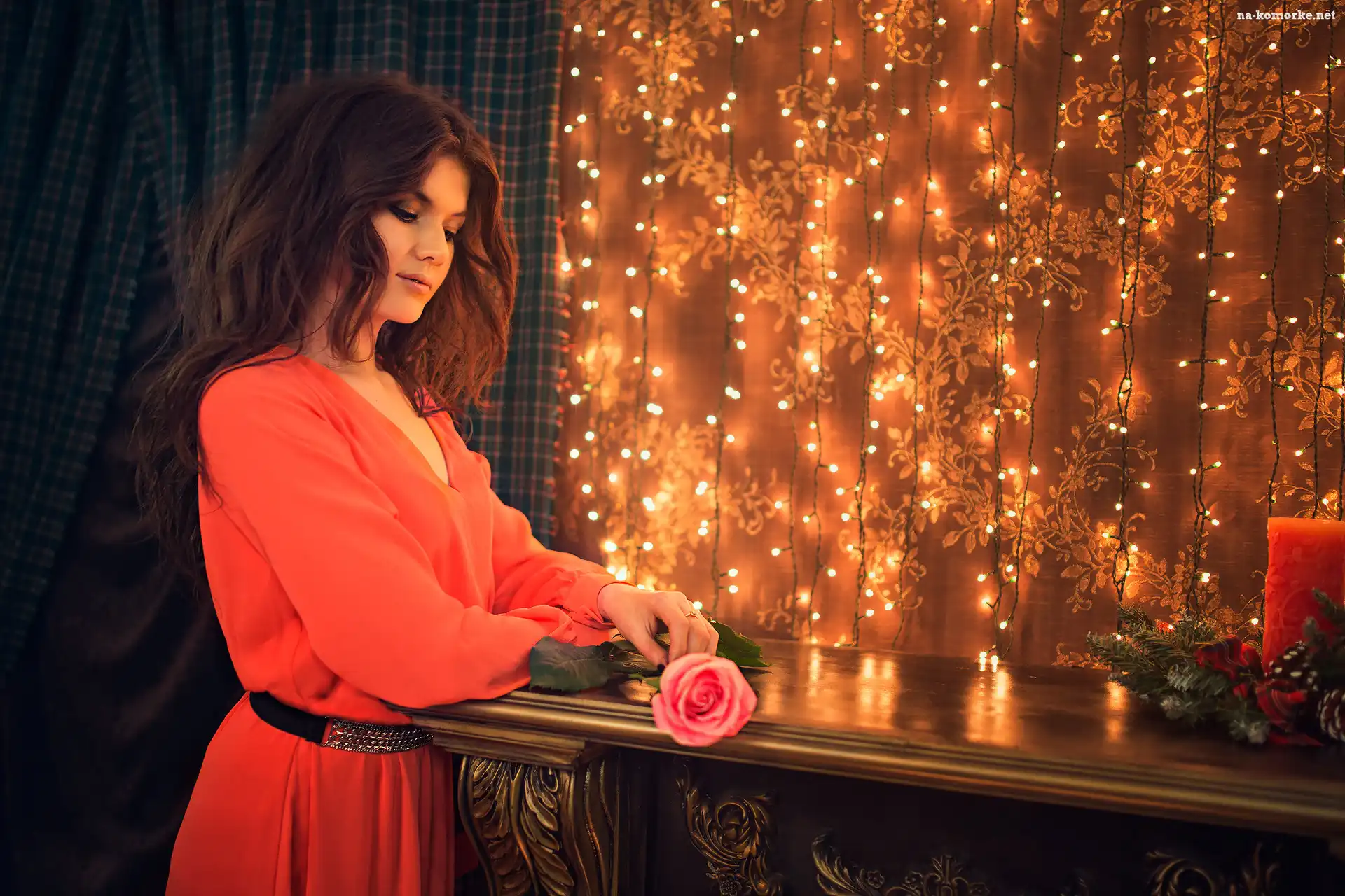 Lampki, Kobieta, Brunetka, Róża, Stroik świąteczny na Komórkę