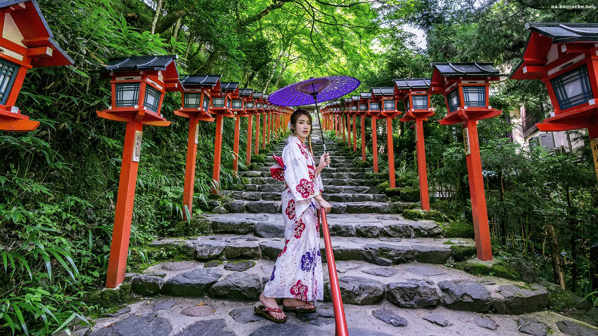 Kimono, Azjatka, Lampy, Parasol, Japonia, Kobieta, Kioto, Schody, Świątynia Kifune Shrine na Komórkę |