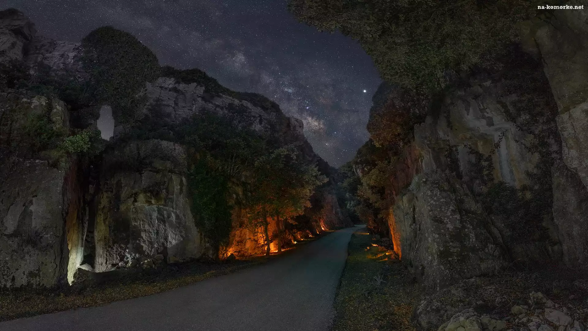 Noc, Lampy, Gwiazdy, Droga, Skały, Drzewa, Przydrożne na Komórkę