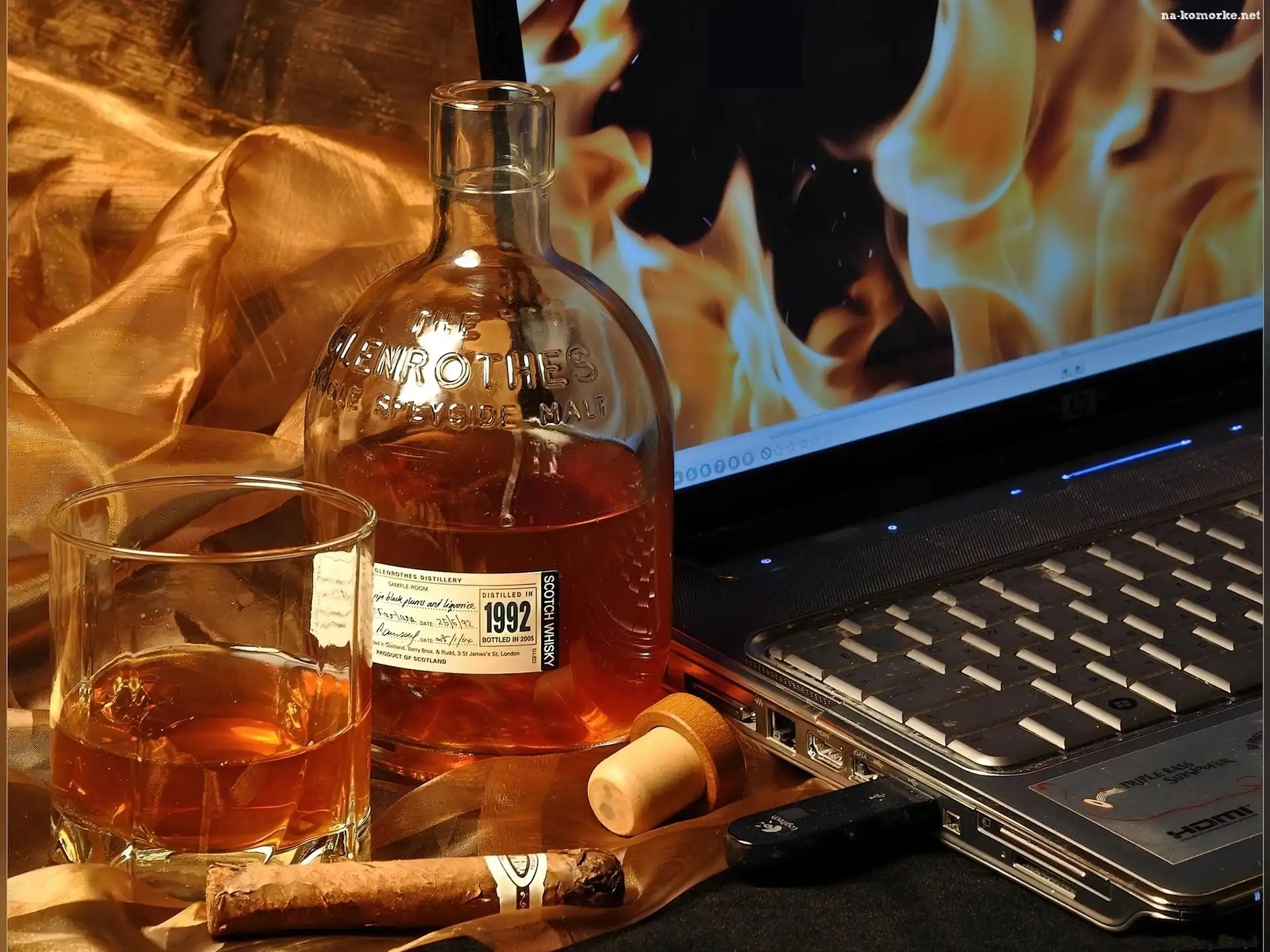 Laptop, Szklaneczka, Butelka, Koniak, Cygaro na Komórkę