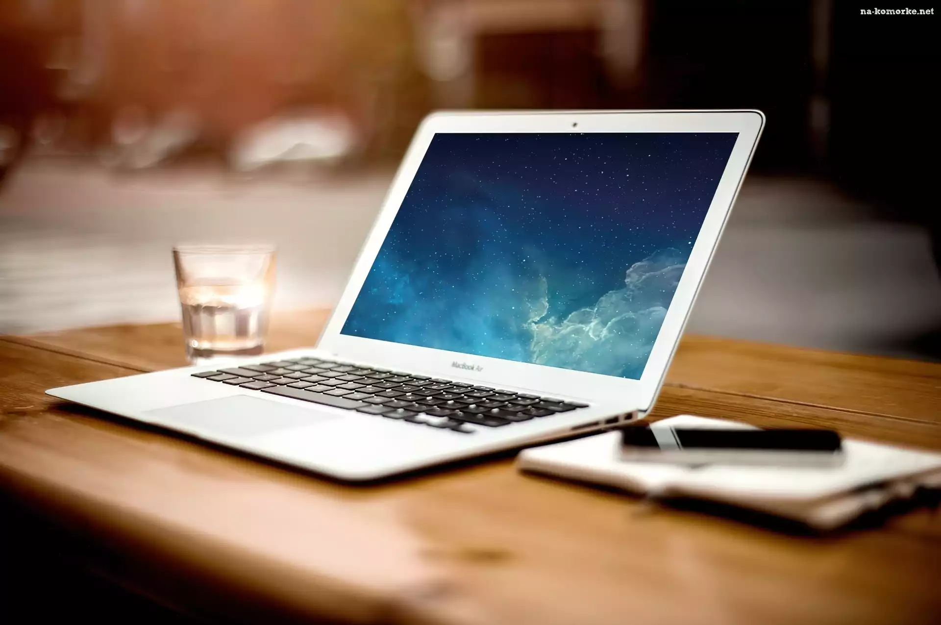 Laptop, Szklanka, Notes, Długopis na Komórkę
