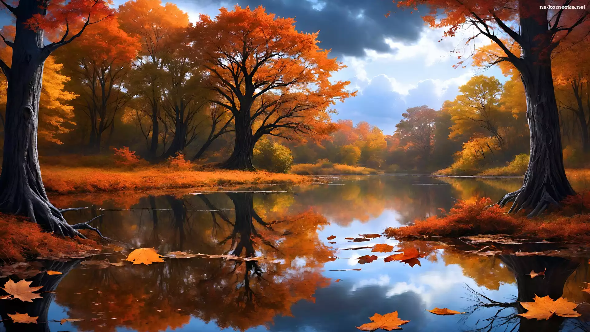 Staw, Drzewa, Jesień, Las, Grafika AI na Komórkę