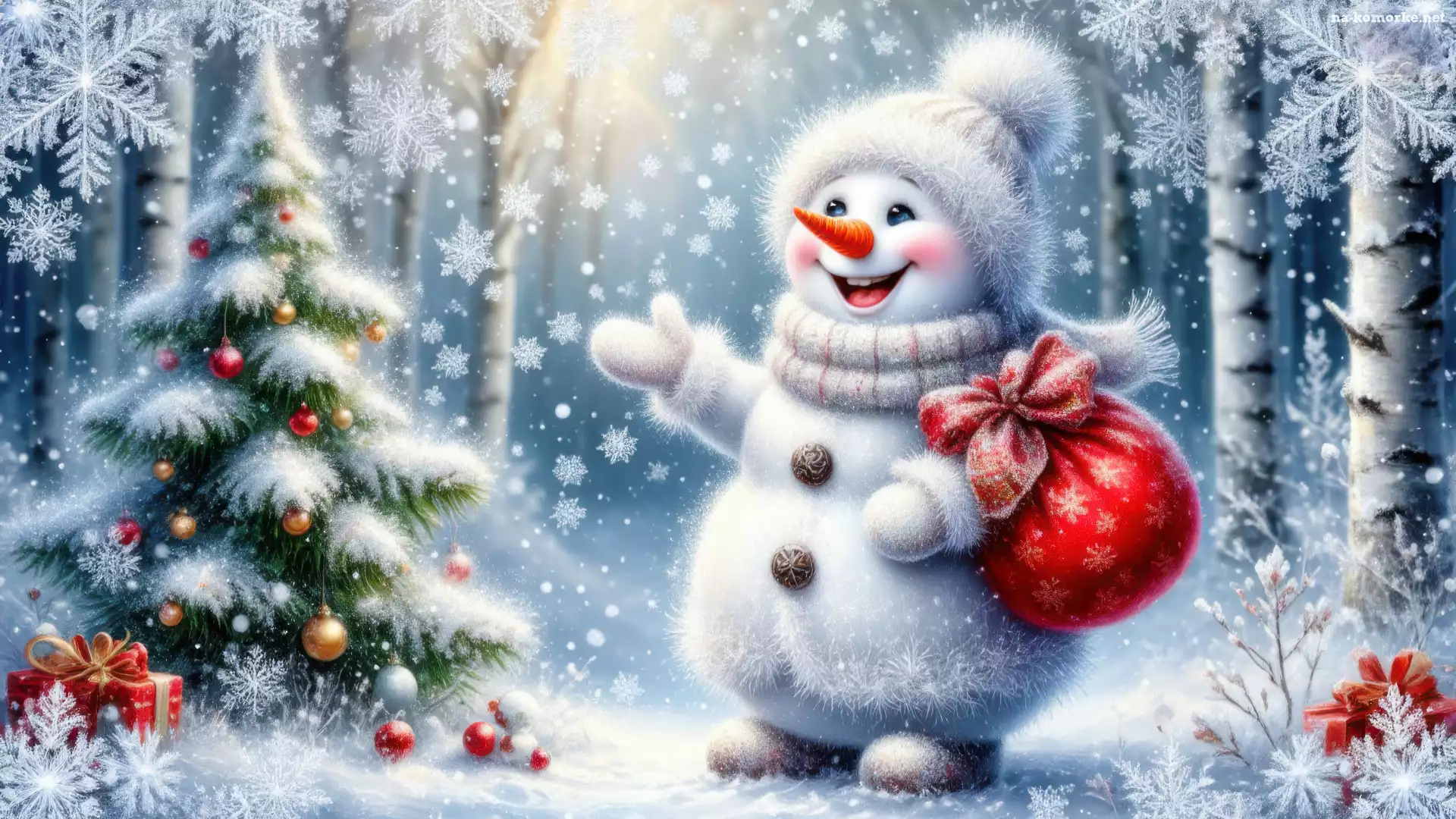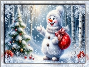 Śnieg, Zima, Choinka, Las, Worek, Bałwanek na Komórkę