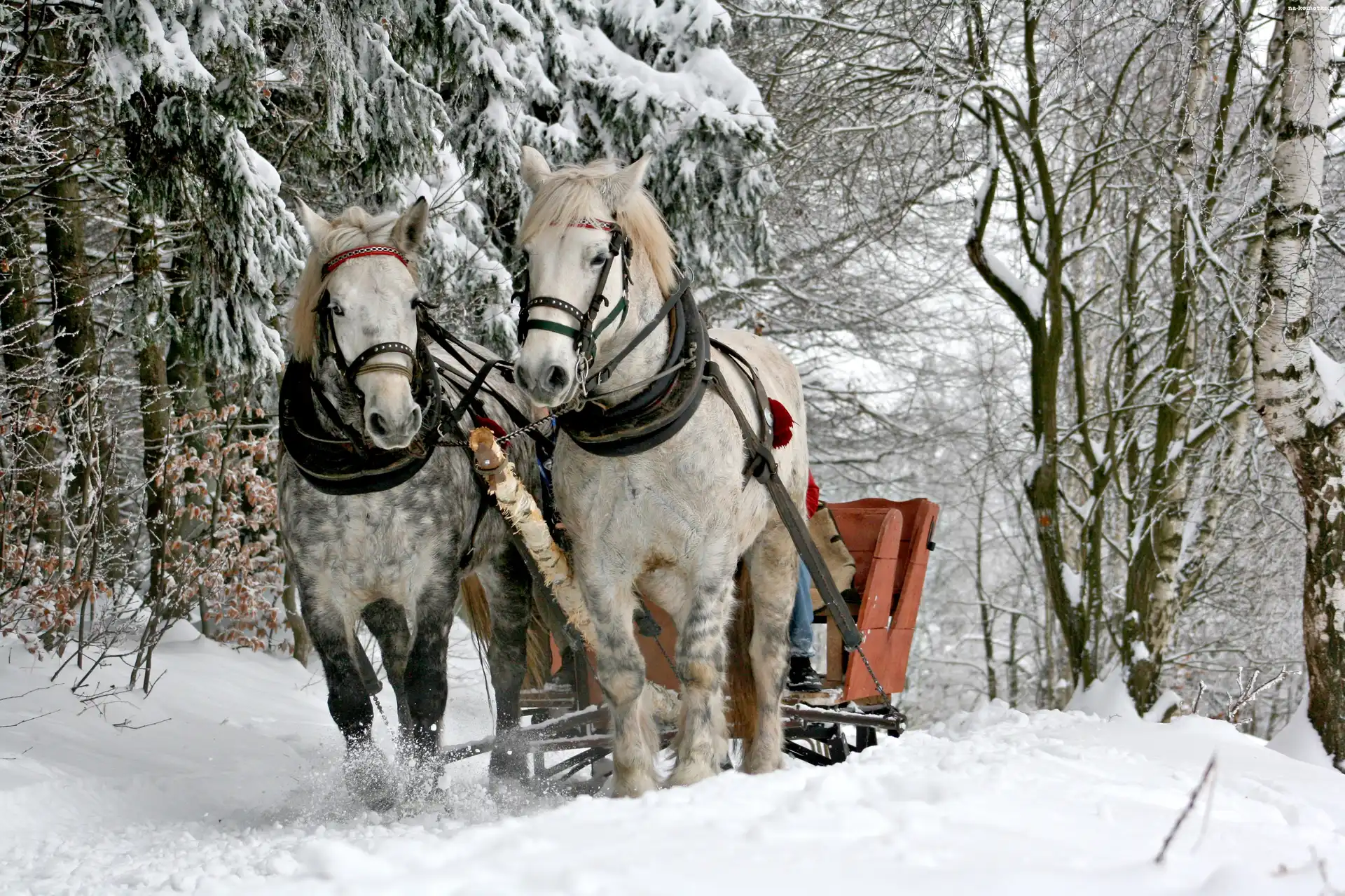 Las, Sanie, Konie, Zima, Droga, Kulig na Komórkę