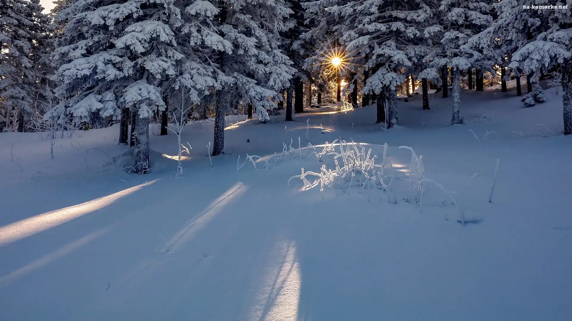 Drzewa, Las, Zima, Promienie słońca, Ośnieżone, Rośliny na Komórkę