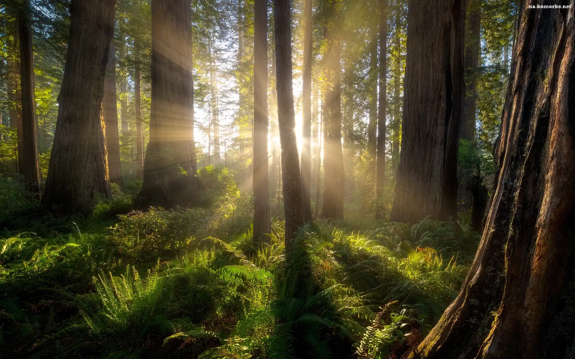 Las, Przebijające światło, Drzewa, Paprocie na Komórkę