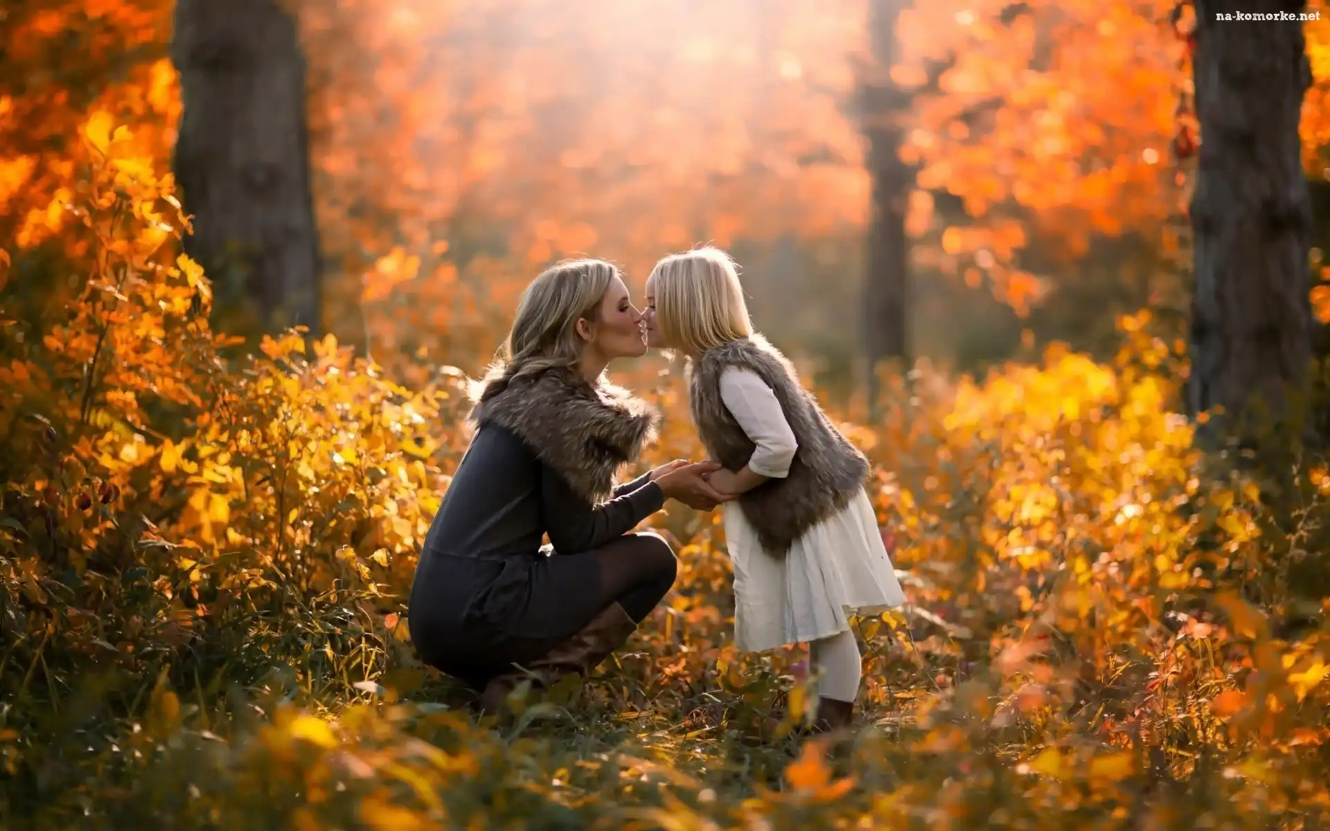 Las, Jesień, Kobieta, Dziewczynka, Pocałunek na Komórkę